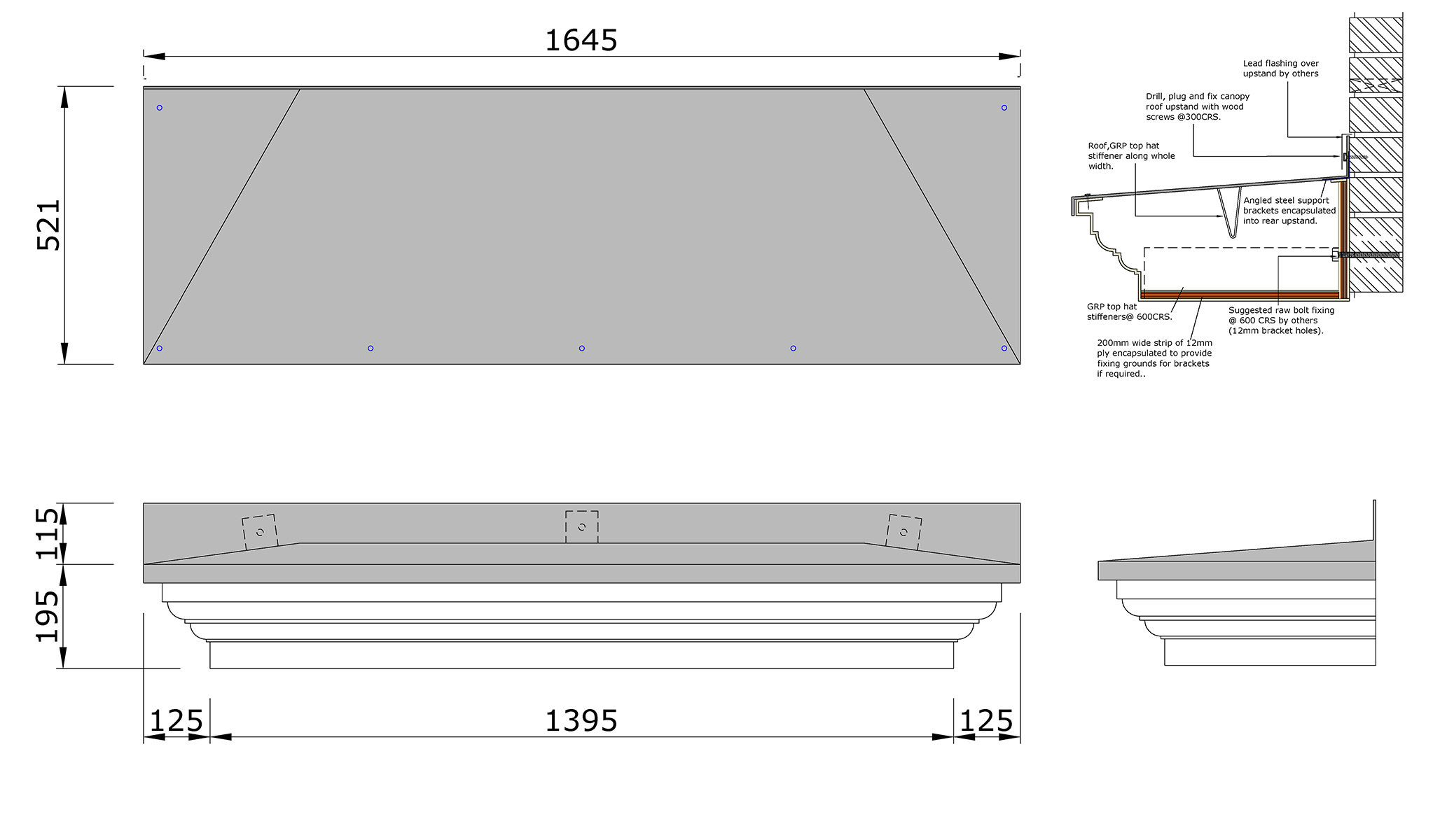 * Image Chilworth canopy can be supplied with or without Plaswood Gallows BracketsImages are for illustration purposes only.Wessex Chilworth replica lead roof entrance door canopy manufactured having feature fascia and soffit. The Chilworth canopy can be supplied with or without Plaswood Gallows Brackets The reproduction lead roof has an integral flash/fixing up-stand. Produced from lightweight long-lasting low maintenance GRP materials. Wessex Chilworth entrance door canopies are manufactured in two component parts, roof and base which when assembled form a complete lightweight unit virtually maintenance free. The Chilworth canopy is delivered pre-finished and is easy and economical to install.