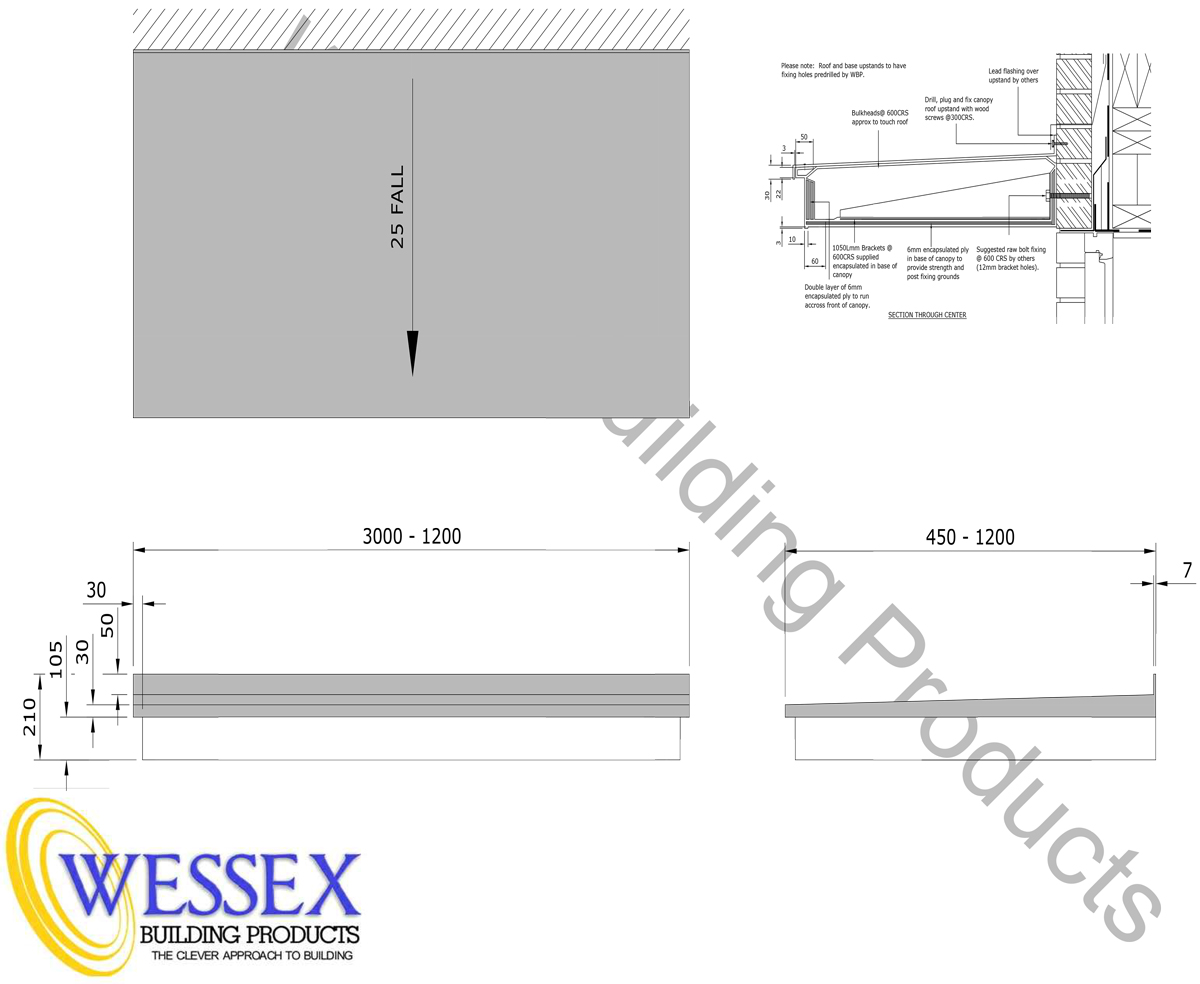 This modern style Wessex door canopy is manufactured from long lasting highly durable GRP. The canopy comes complete with in-built steel anchor brackets which provide and allow a robust and concealed fixing arrangement. Maintenance of your Wessex entrance door canopy is not required apart from occasional cleaning to remove any dirt or grubby marks with a damp cloth and household non abrasive detergent. Wessex Building Products have been manufacturing entrance door canopies for over 35 years and found that that GRP canopies exposed to the elements and natural light for periods in excess of 10 years do not suffer any significant change in the physical properties of the canopy. Life expectancy beyond 40 years can be expected.