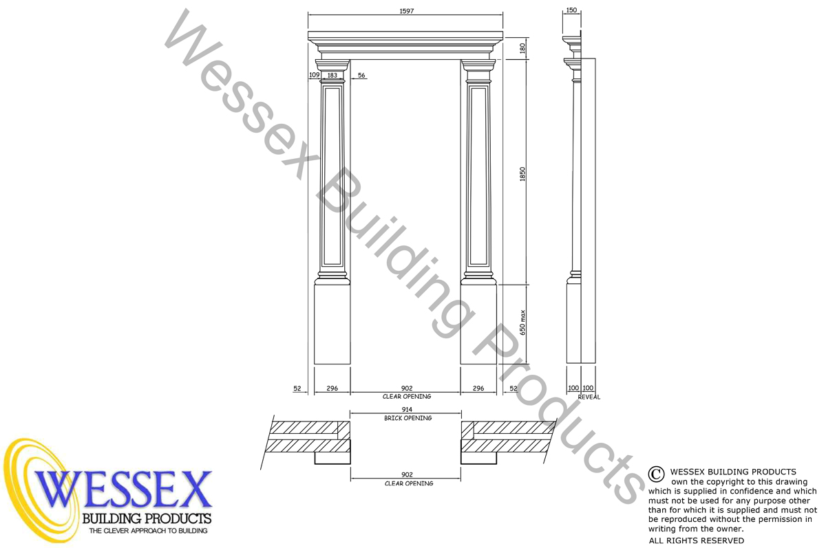 The Honiton door surround has been produced to take account of varying height requirements which can be accommodated by simply cutting the lower plinth to suit the desired height between 50 – 650mm adjustment is available, this is particularly advantages in stepped situations. Each piaster and the surround head have 100mm extended returns allowing the brickwork opening to be concealed to the door frame if required providing a clean lining around the door opening.
