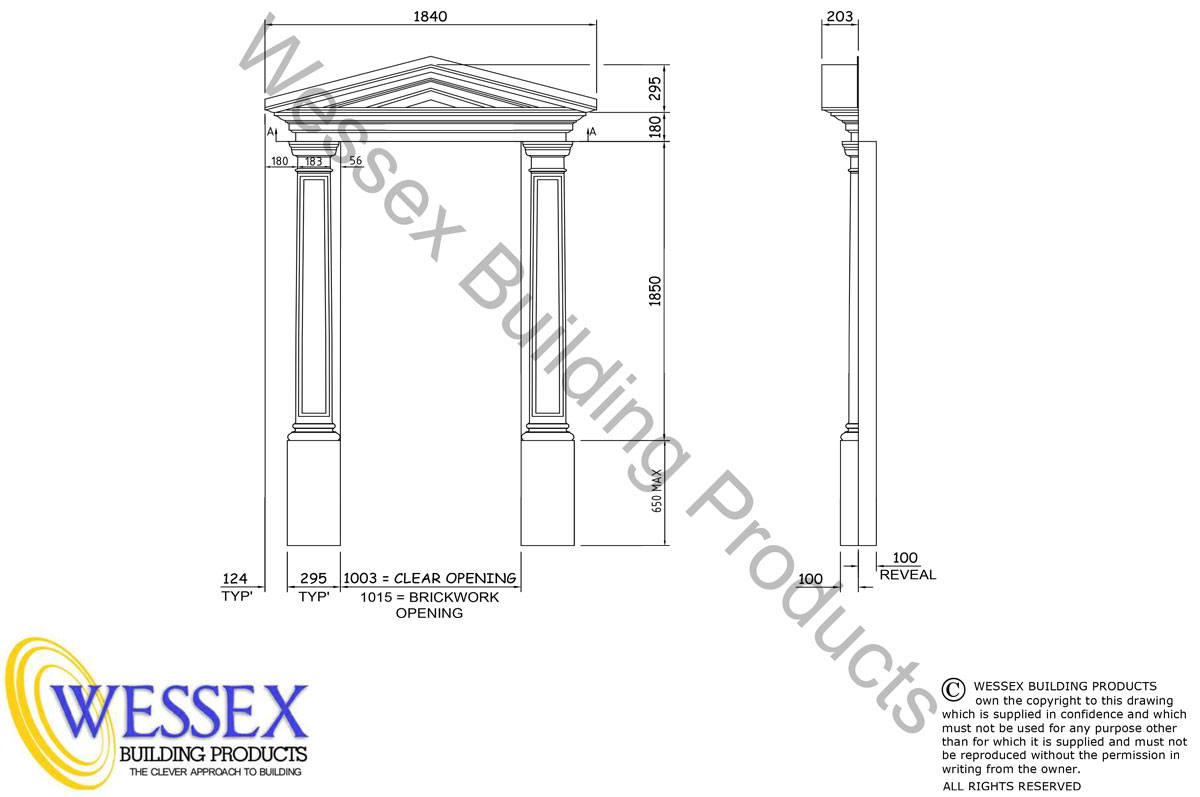 The Verwood door surround has been produced to take account of varying height requirements which can be accommodated by simply cutting the lower plinth to suit the desired height between 50 – 650mm adjustment is available, this is particularly advantages in stepped situations. Each piaster and the surround head have 100mm extended returns allowing the brickwork opening to be concealed to the door frame if required providing a clean lining around the door opening.