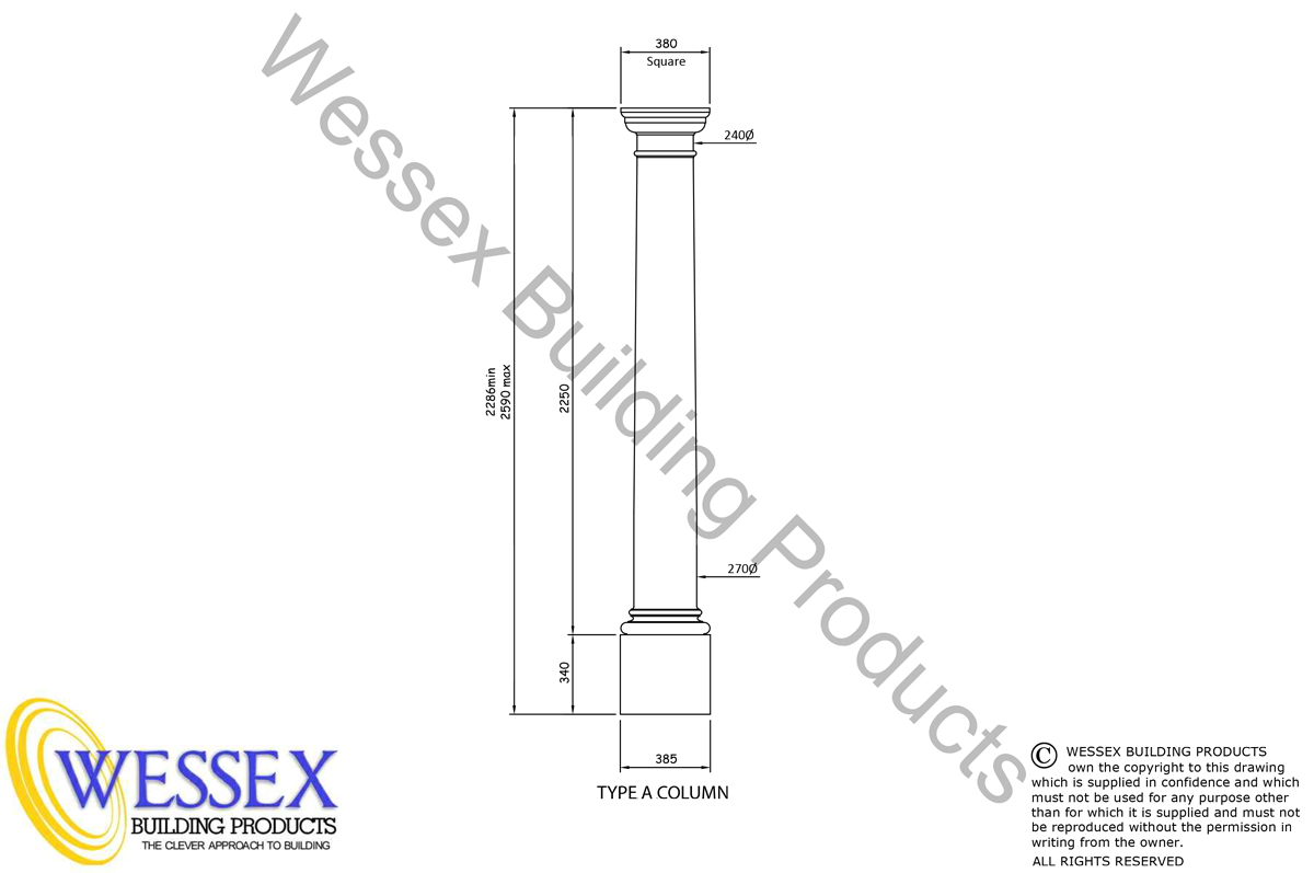 Wessex Type A, Plain Doric column, manufactured in pre-finished white GRP. Maximum height 2590mm which can be reduced by cutting down the plinth box by up to 300mm