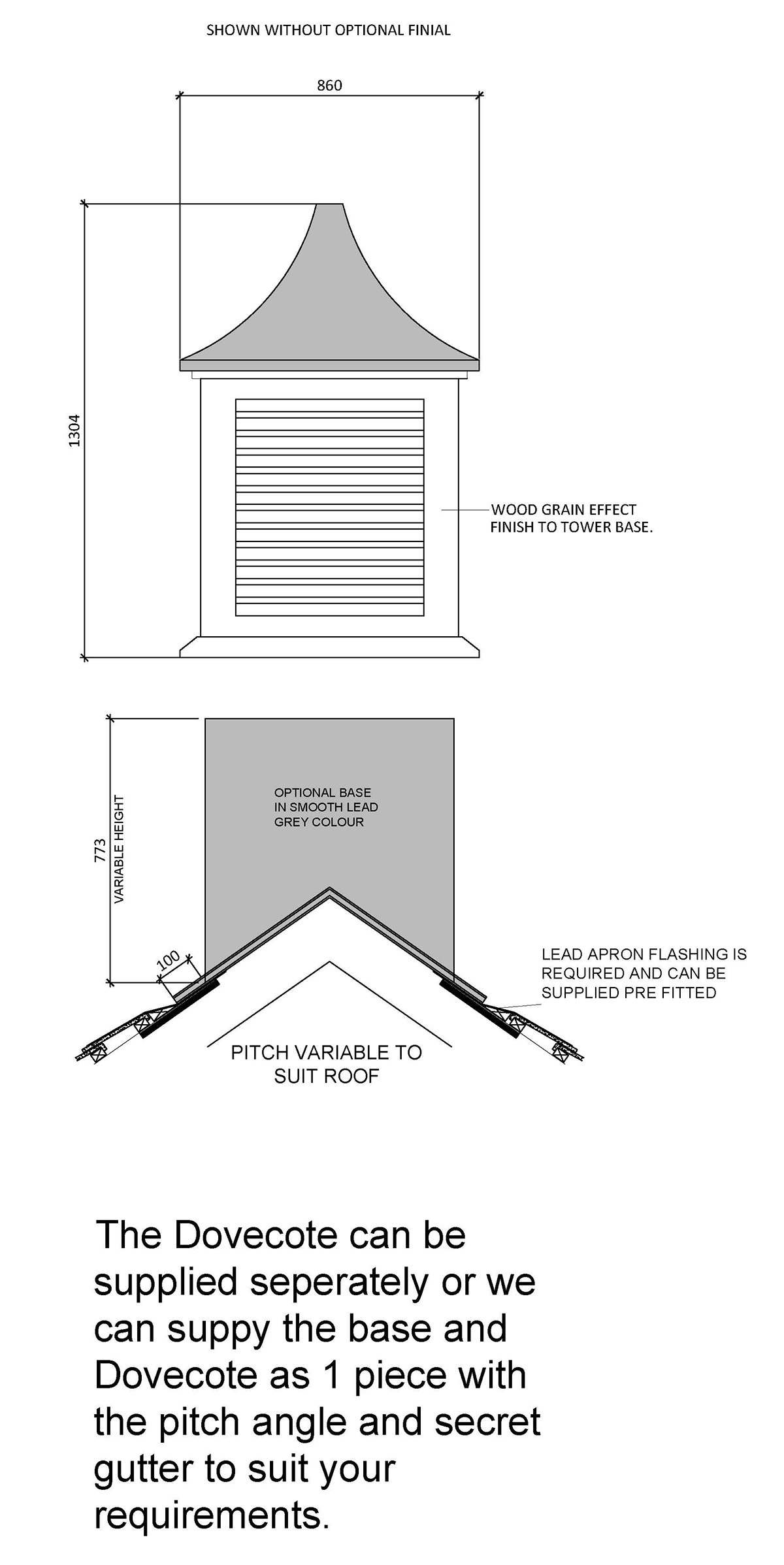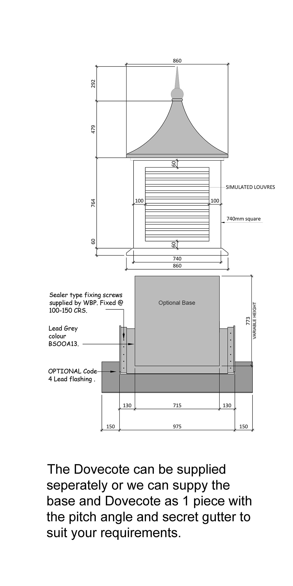 The Wessex WBP - 70104 GRP dovecote tower with concave replica lead roof manufactured with moulded side paneling including integral dummy louvers.. Optional extras include weather vanes, finials, clocks and working louver vents. Wessex GRP dovecote towers have been developed to allow individual and architectural tastes to be expressed for both refurbishment and new-build projects.