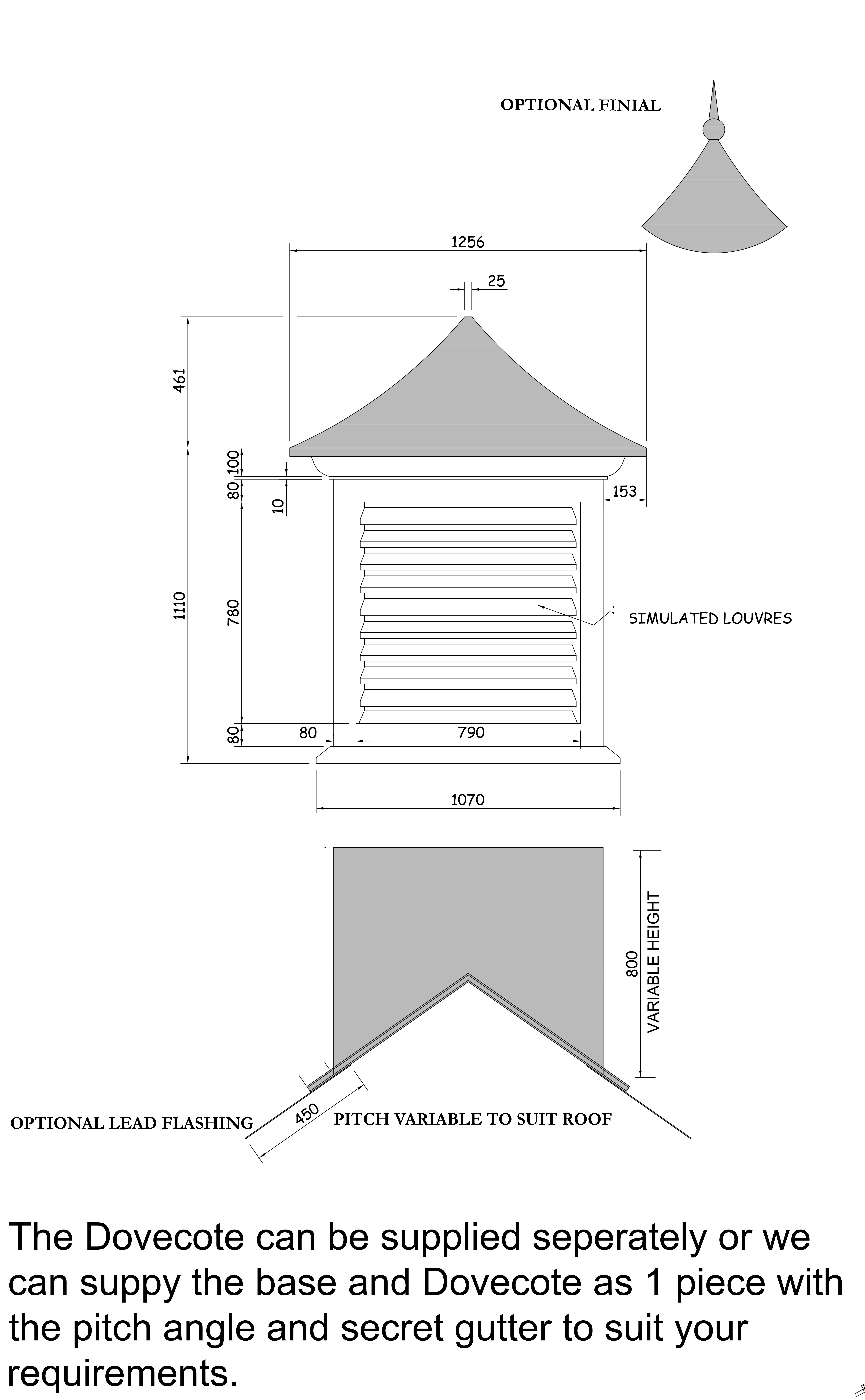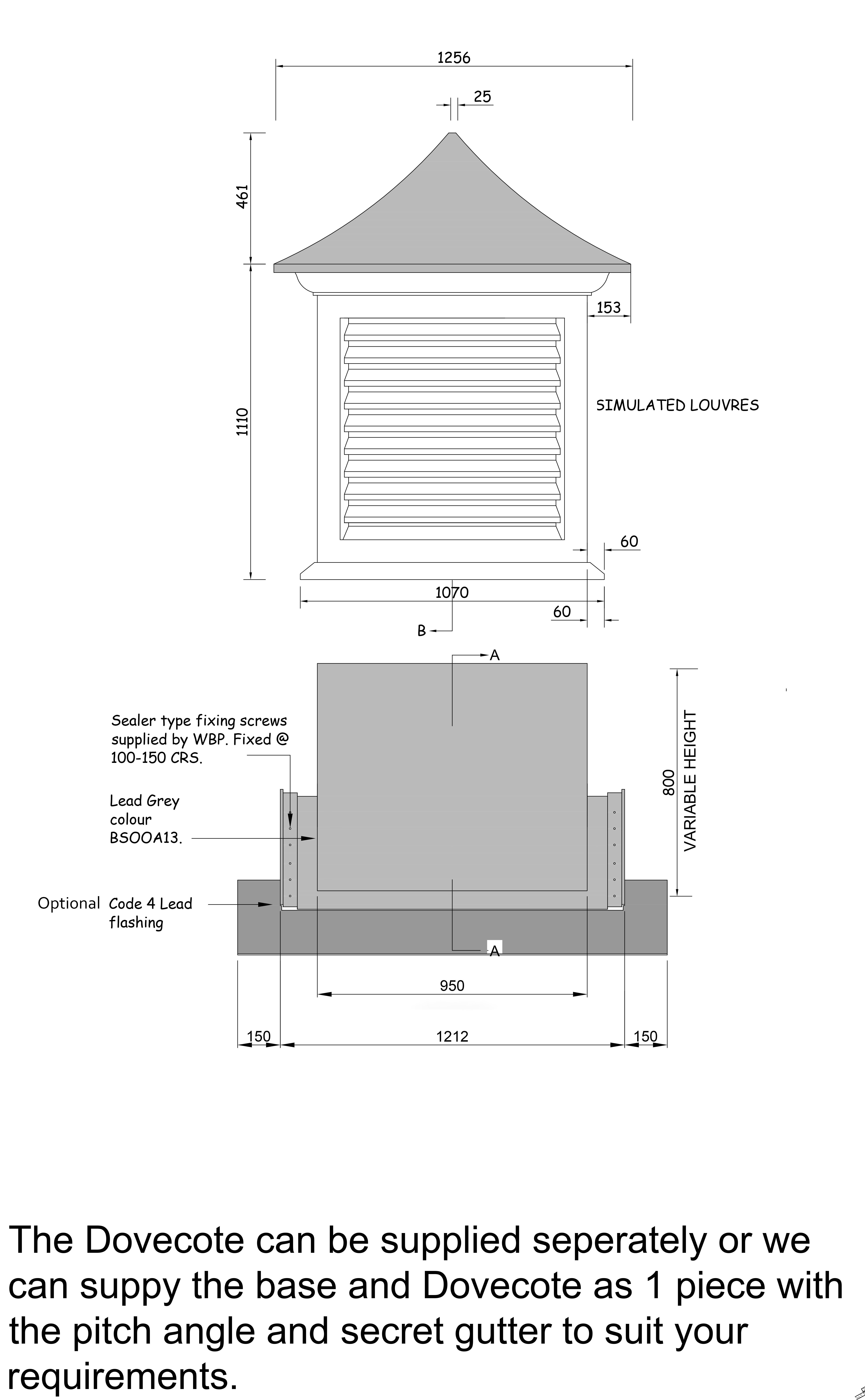 The Wessex WBP - 70108 GRP dovecote tower with concave replica lead roof manufactured with moulded side paneling including integral dummy louvers.. Optional extras include weather vanes, finials, clocks and working Louvre vents. Wessex GRP dovecote towers have been developed to allow individual and architectural tastes to be expressed for both refurbishment and new-build projects.
