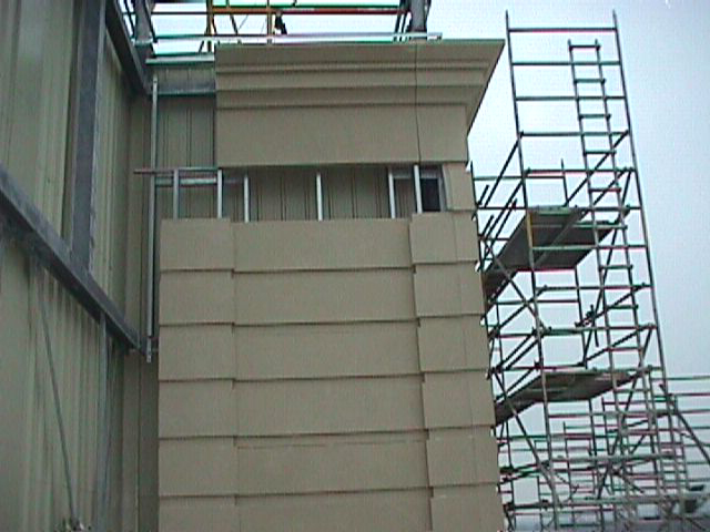 The mock-up was produced and assembled at our Salisbury factory and installed to a steel frame produced by our Engineering Department to represent the steel of the buildings structure with supporting secondary steel sub framing designed by our in house design team to allow the attachment of the GRP cladding elements to be carried out. The mock-up panel was produced to the full height of the upper elevation wall and three metres wide. This was transported to the Site and crane hoisted into position and attached by steel brackets, providing the client and the Architectural design team with a realistic model of the proposed cladding concept. The mock-up proved to be well worth the time and provided the client with the confidence to award us with the contract for the entire main GRP cladding works.